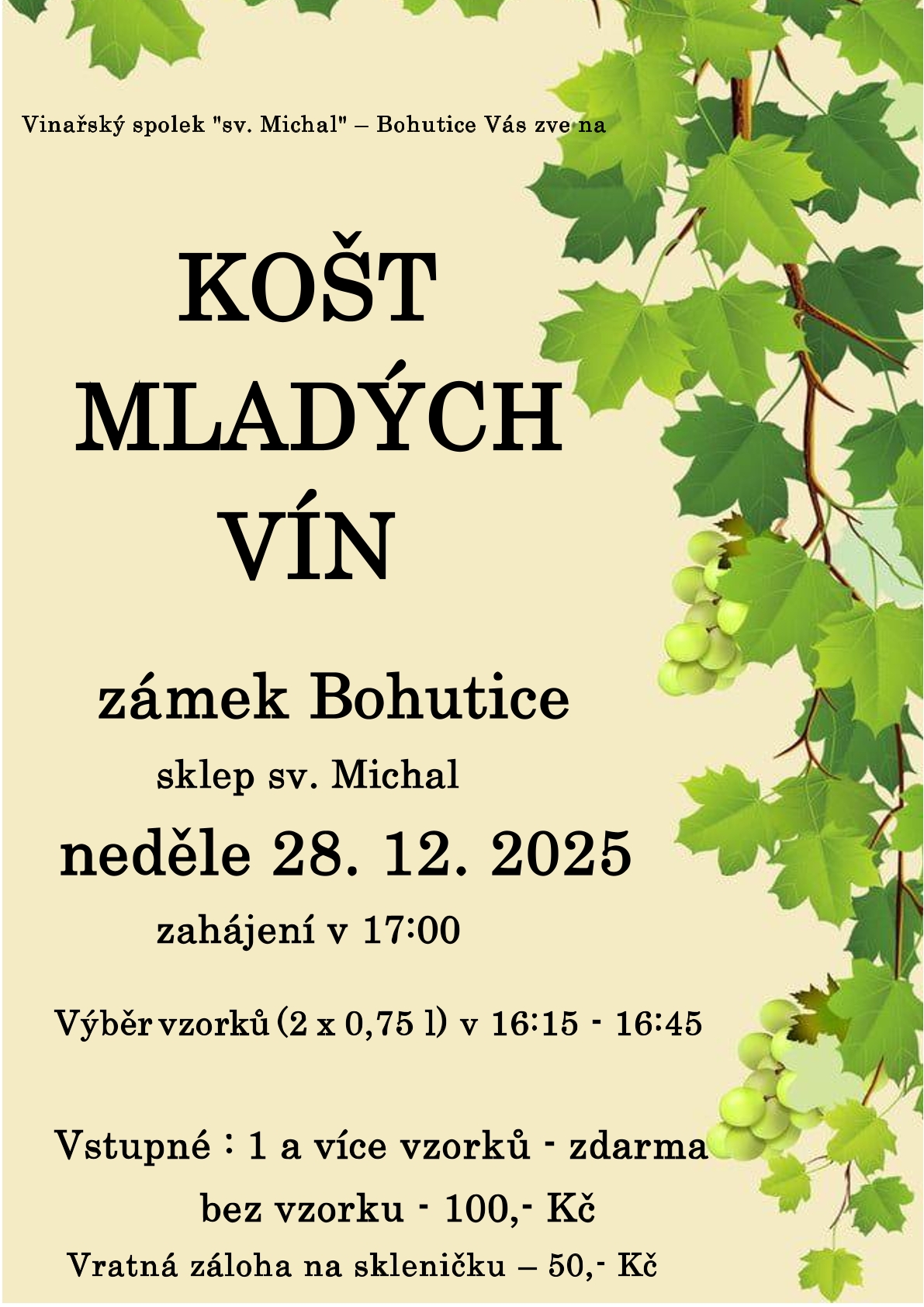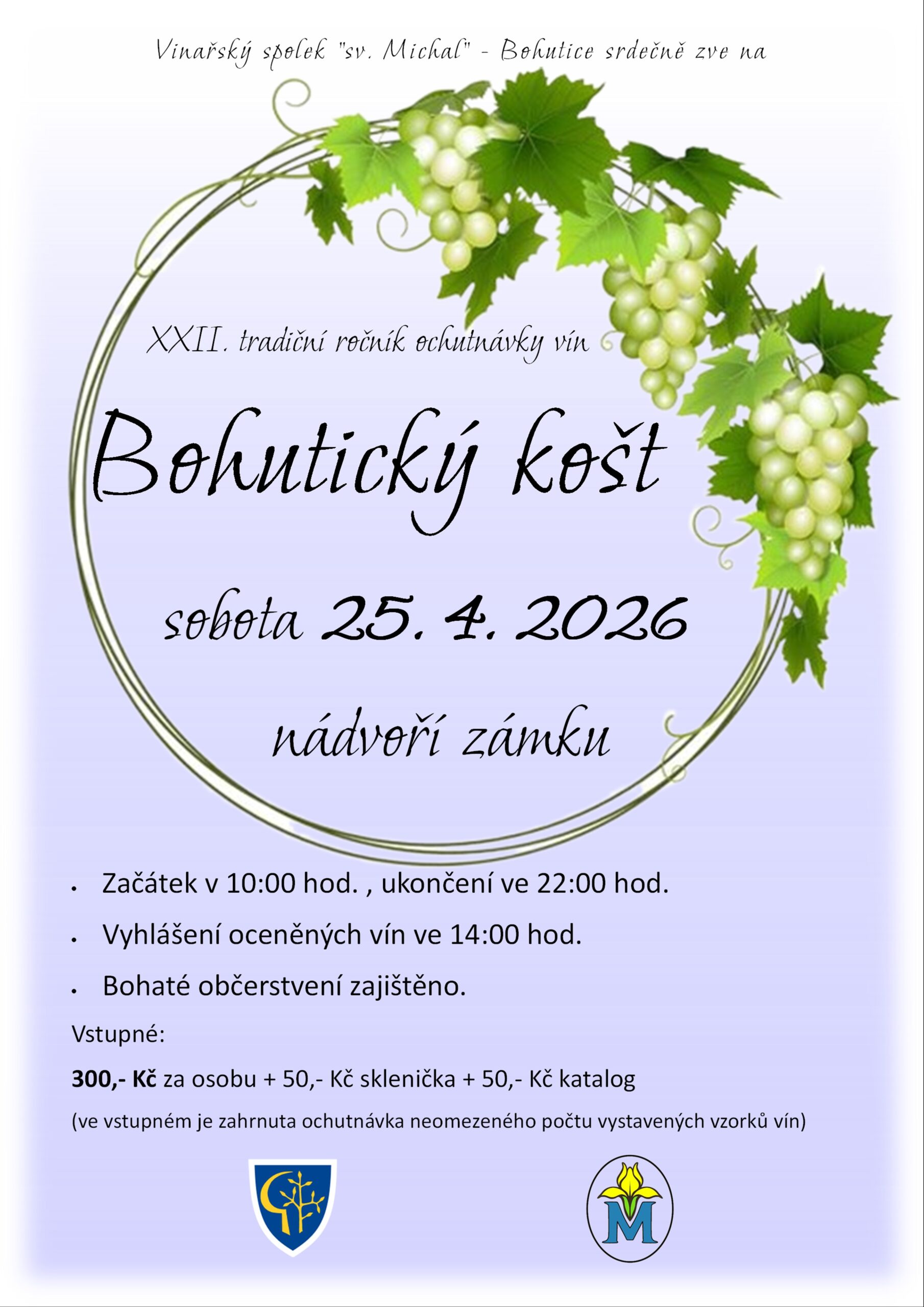 Každoročně pořádáme několik akci. Nejvýznamnější akcí naše spolku je Bohutický košt, který se koná pravidelně v poslední sobotu v dubnu. Dále můžete např. ochutnat naše vína na Letní meruňkové noci v poslední sobotu v červenci. V říjnu se konají Podzimní bohutické slavnosti, kde prezentujeme svá vína na řízené degustaci. A v prosinci koncem roku bývá Košt mladých vín. Stavte se a ochutnejte naše vína…