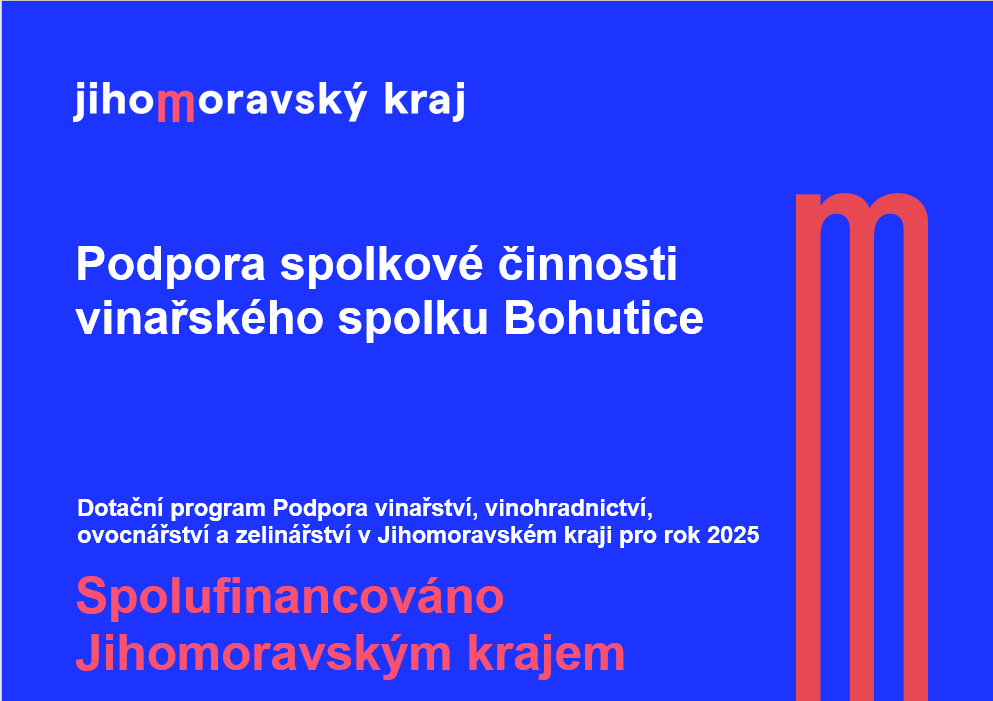 Děkujeme Jihomoravskému kraji za poskytnutou dotaci na pořízení 2 párty stanů velikosti 6x4m, skleniček a katalogů Bohutického koštu.